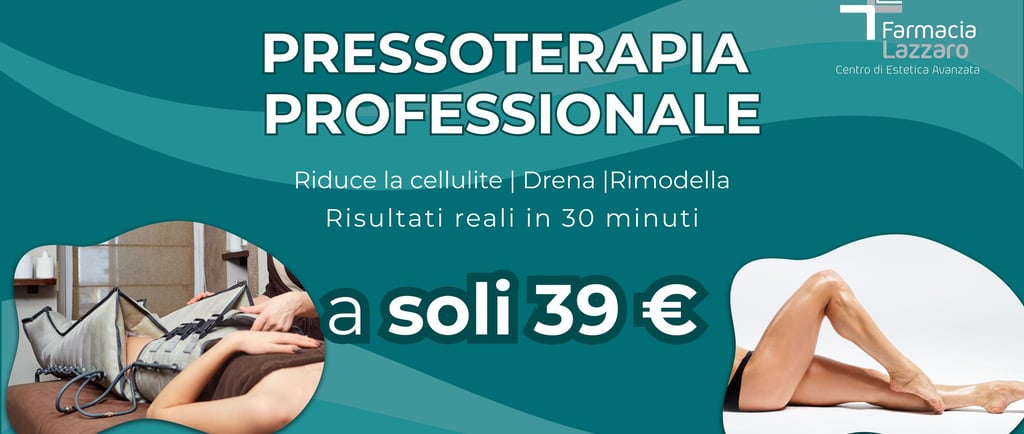 Presso il Centro di Estetica Avanzata della Farmacia Lazzaro, puoi provare la pressoterapia professionale a soli 39€. Un trattamento completo, eseguito da personale qualificato, che offre risultati visibili fin dalla prima seduta.